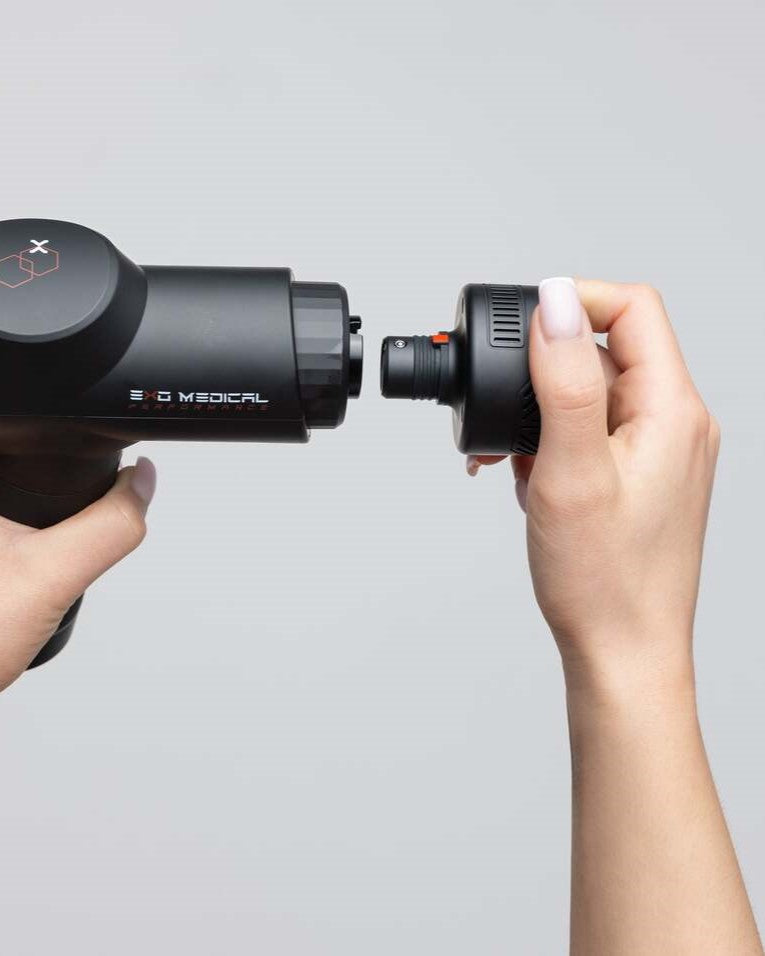 5 aplikatorów: różne głowice do łagodzenia napięcia mięśniowego i przyspieszania głębokiej i powierzchniowej regeneracji (Thermo, Spine, Cone, Soft, Sphere).